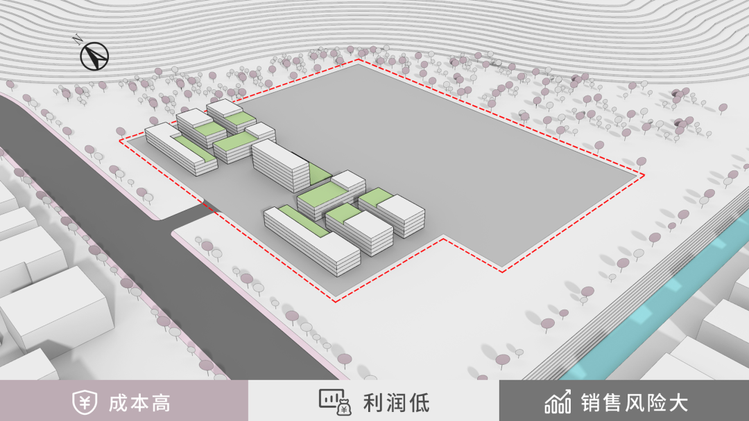 沿街布置多层研发厂房,虽然有了沿街形象满足了规划要求,但是多层厂房成本高,利润低,而且此类产品在当地销售风险比较大。