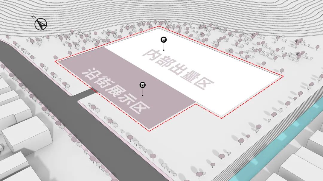 将用地分成东西两个区域,分别定义为沿街展示区与内部出量区。