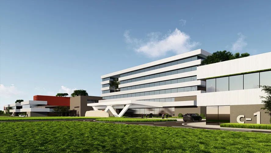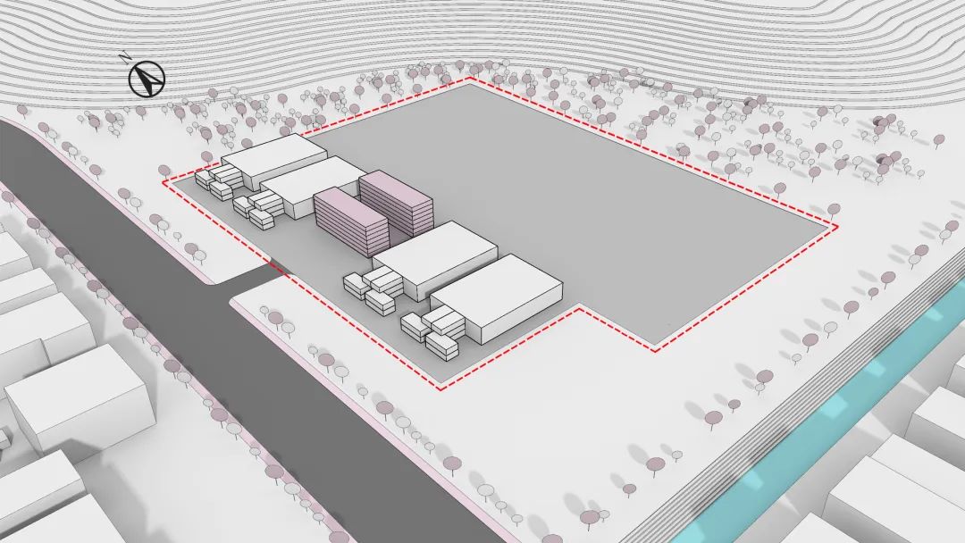中心做一栋办公楼,用足15%的办公配套指标,满足自用同时增加后期可能性,再挤出一栋多层研发厂房,最后还形成高低错落的天际线满足规划要求。