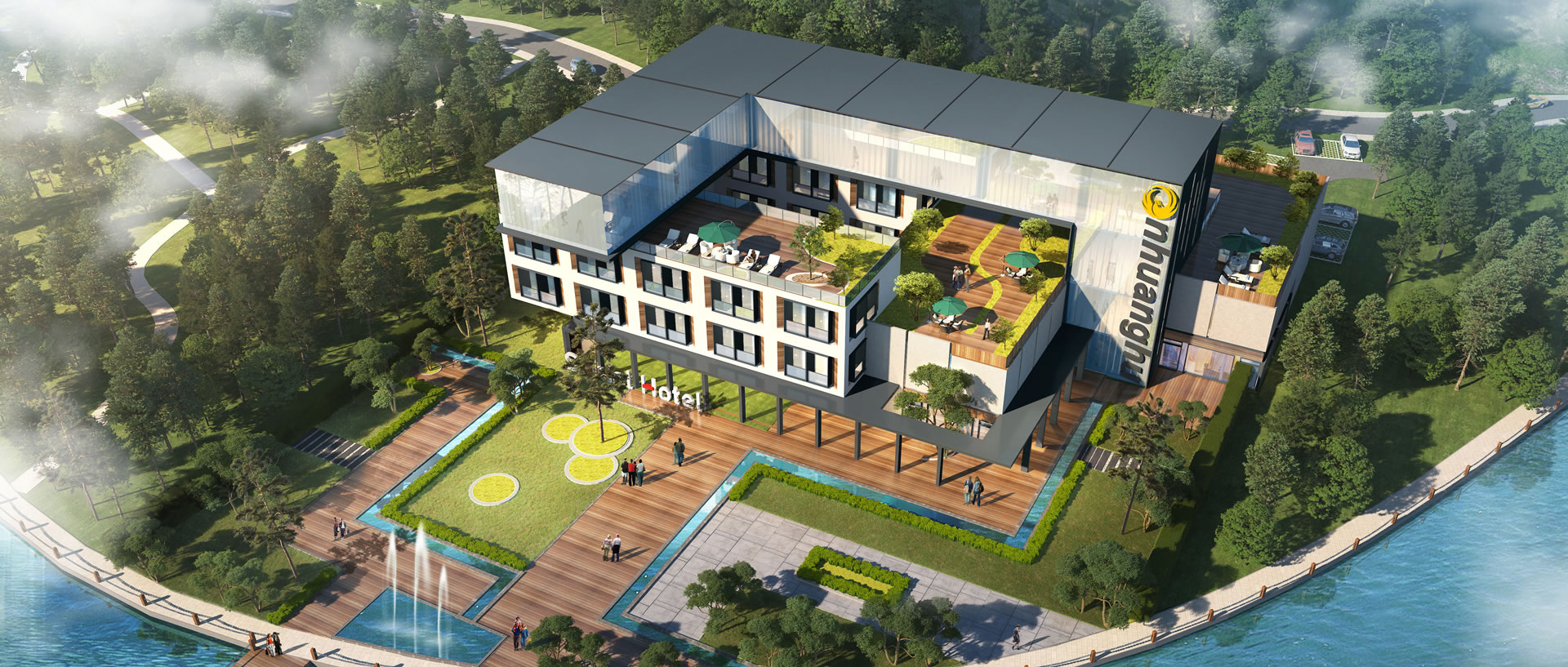 还记得之前设计的这个滨湖酒店吗?业主说他最近又有了新想法,想让我们还是在这块地上,重新帮他设计一个更炫酷的酒店。老规矩,还是先来分析用地。地块1临近主路作为酒店前场组织交通流线,地块2布置建筑体块。新的方案,酒店客房我们抛弃传统的内廊式思路,这次采用外廊式布局。根据外廊式客房进深将建筑体块最大范围落入地块。发现这样的形体太单一,我们动下鼠标将大体块一分为二。靠山处视线太堵,靠湖处离水面太近。所以还要分别退让,局部打开延伸。形成2个C形体块。我们把视角切换一下,站在湖边远眺酒店,建筑形体有些扁平还是不够炫酷。我们回忆了下业主的诉求,他说还要一个空中空间。我们再用新的体块自下而上将建筑形体联系拔高,形成一个炫酷的立体形像。这一部分用作酒店的商务接待,康体休闲功能使用。这一版方案本着开放互通的核心原则形成3个紧密相扣的体块。酒店坚持“小房间、大公区”的原则,引导顾客走出房间去到公区社交活动。这样的酒店不只有住宿收益,还能通过室外、屋顶、空中等公共空间承接各种主题IP活动,拓宽收益渠道。